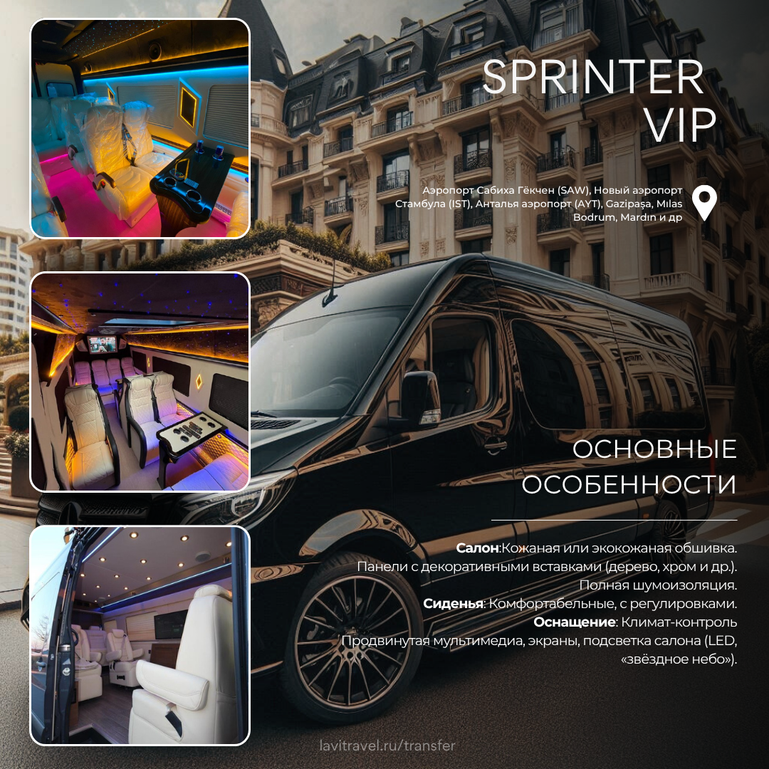 - Доступные модели: Mercedes-Benz E-Class, Mercedes-Benz Vito, Maybach Vito, Sprinter, Midi, Bigbus.
